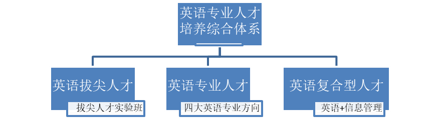 本专业秉持“分类培养、分类卓越”的人才培养原则。通过拔尖人才实验班,挑选有志从事“本硕博贯通式学习”的本科生,配以学术导师,进行个性化、研究型和国际化的指导,培养具有学术创新能力的英语专业拔尖人才。通过英语专业的课程模块设置,将英语技能课程、人文通识课程和特色专业知识课程相联动,培养英美文学、英语语言学、跨文化研究、高级翻译四大专业方向的英语专业人才。通过“英语+信息管理”的跨学科模式,培养适应人工智能与大数据时代信息处理需求的复合型英语人才。最终,我们将打造一个包含“英语拔尖人才”、“英语专业人才”和“英语复合型人才”的141综合人才培养体系,服务和引领社会,共创繁荣与文明。