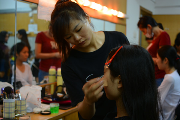 精彩的演出往往离不开后台工作人员的默默付出。道具定位,舞台布置,灯光和音效调试,演员化妆等都需要工作人员们在正式表演前提前做好准备。也正是幕后工作人员不畏艰辛的努力,使第三次彩排及正式演出得以有条不紊地进行。