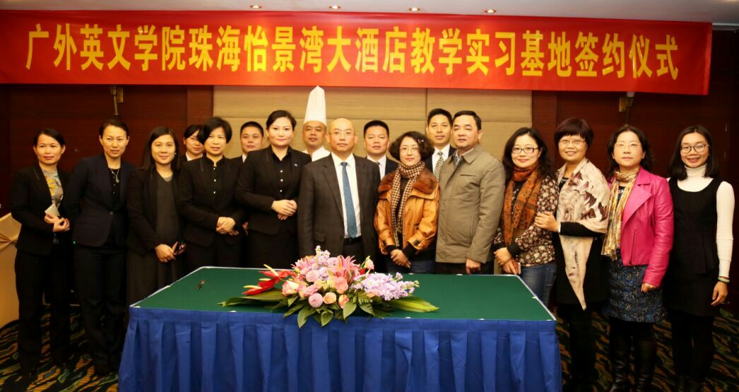 本网讯 2015年12月18日,广东外语外贸大学英文学院与珠海怡景湾大酒店举行了“广外英文学院珠海怡景湾大酒店教学实习基地签约仪式”,此仪式标志了广外英文学院正式在珠海设立酒店教学实践基地。广外英文学院副院长姜琳教授与珠海怡景湾大酒店总经理周智寅先生共同在协议书上签字。广外英文学院副书记何伟儒、副院长张欣、文学系主任刘胡敏、国际旅游系主任钟虹、怡景湾大酒店助理总经理沈洁、旅游系有关老师和酒店各部门总监均参加了签约仪式。周智寅总经理在致辞中表示希望与广外共同培养具备竞争力的外语系毕业生,姜琳副院长表示此实习基地获得学院领导的大力支持,希望与业界优秀管理人员一起帮助学生的成长。