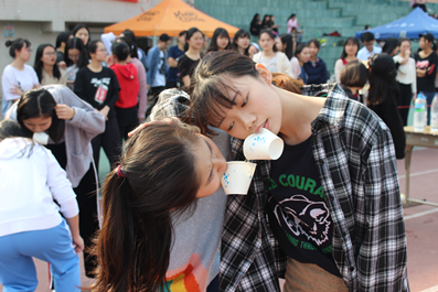 随后进行的是“杯水传情之五福临门”项目。各队均表现优异,选手们用嘴衔杯子传水依然能够稳定而高效。最终,1709班的“五花肉队”凭借熟练的技巧和出色的团队合作能力获得冠军。