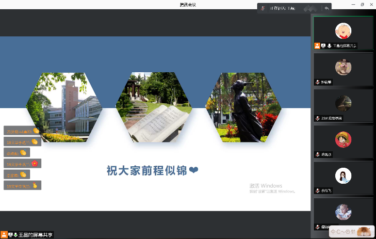 最后,王晶老师对所有研究生们给予了最美好的祝福,祝福毕业生们前程似景,在校研究生们学习进步,研究生同学们也通过会议聊天框向王晶老师表达了真诚的谢意,至此会议圆满结束。