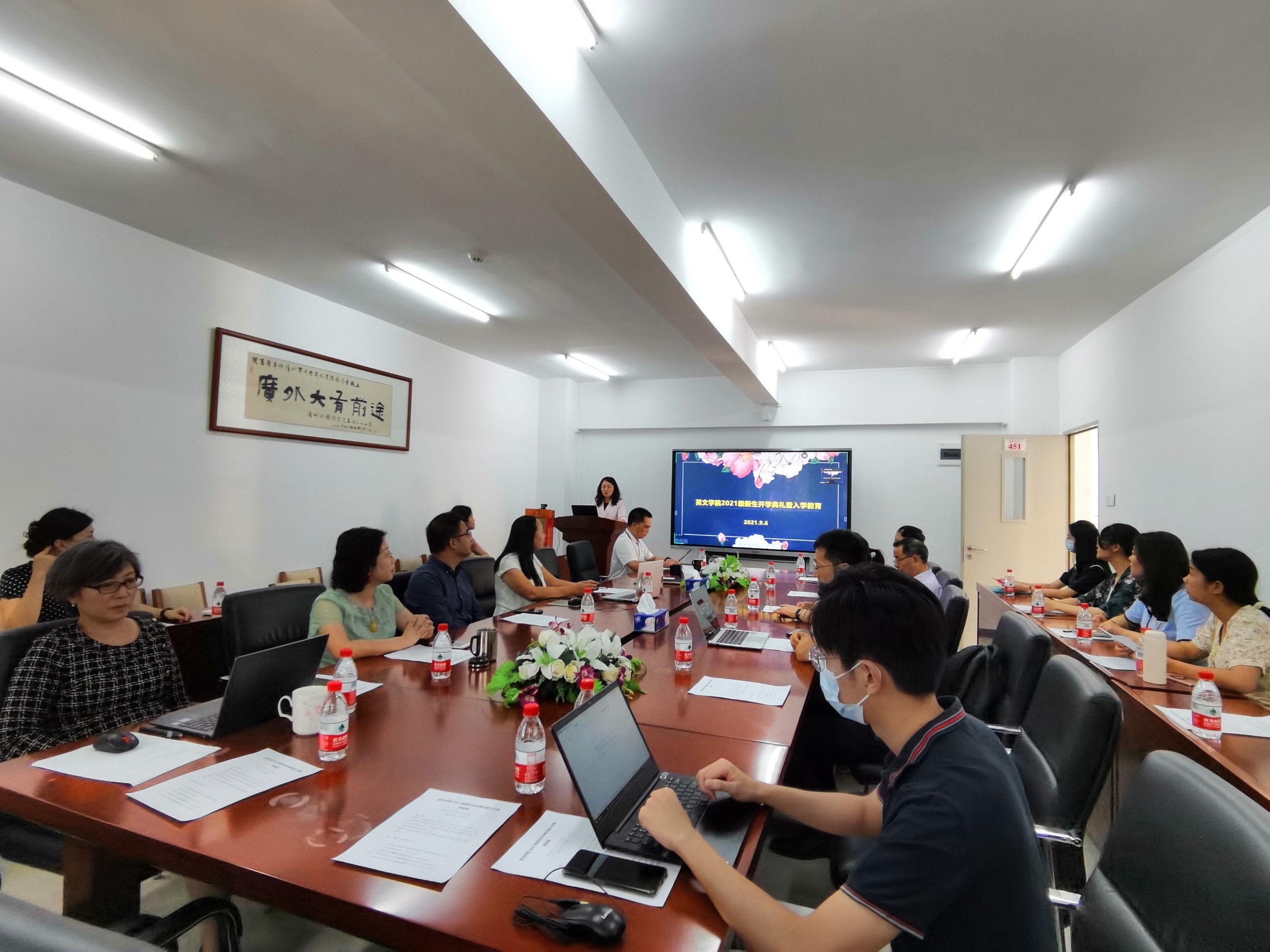 2021年9月6日下午,英文学院举行2021级新生开学典礼暨入学教育活动。英文学院全体领导班子、教师代表、各系主任、全体辅导员及2021级本科生、研究生新生分别在主会场和分会场共同参加仪式,开学典礼由林绍雄书记主持。