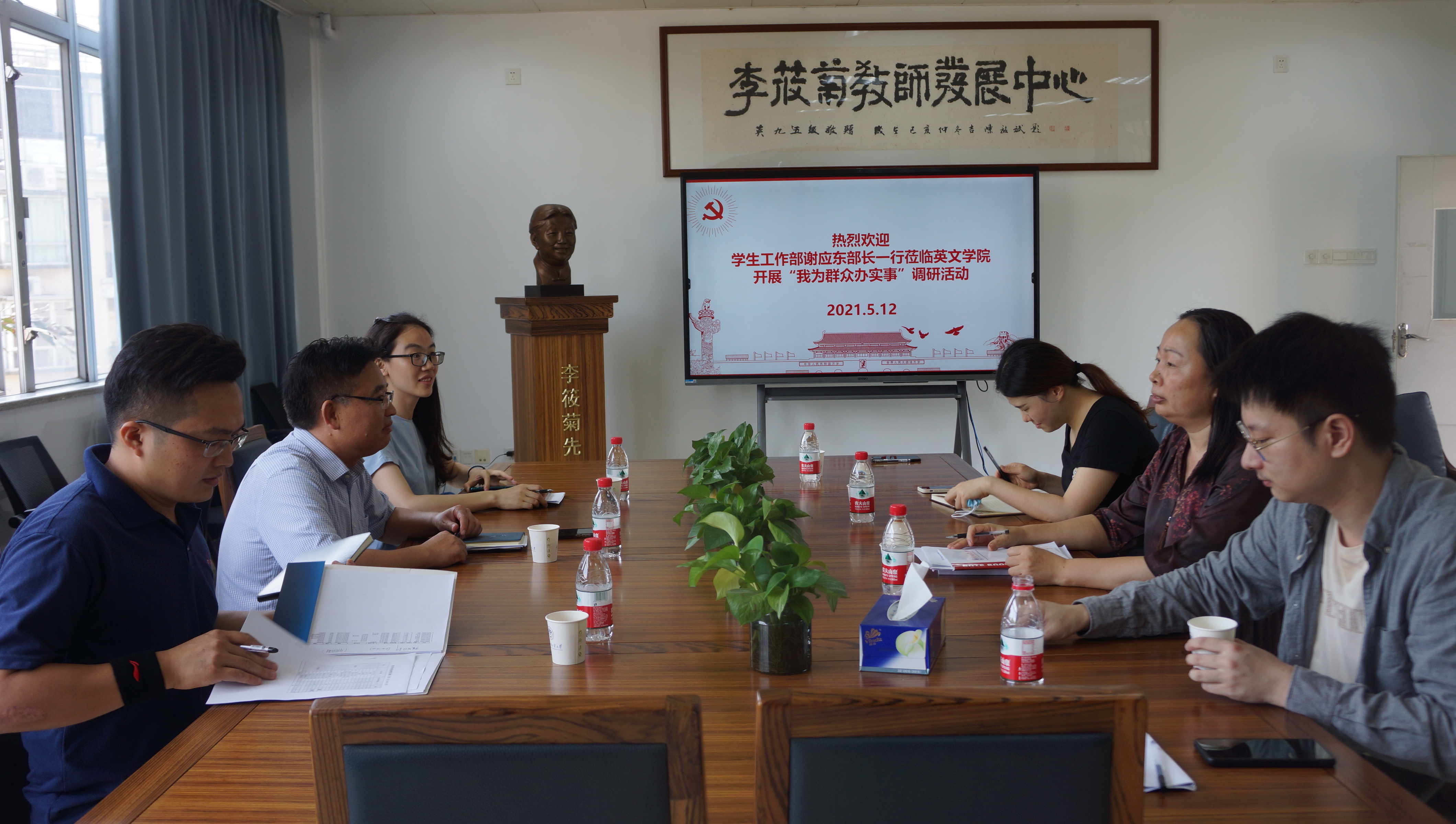 为迎接中国共产党成立 100 周年,将“学党史、悟思想、办实事、开新局”贯穿学生工作全过程,认真学习贯彻习近平总书记在党史学习教育动员大会上的重要讲话精神,5月12日上午,学生工作部(处)长谢应东带队到英文学院七教421会议室开展“我为群众办实事”座谈会,英文学院党委副书记黄晓梅、辅导员参与座谈。