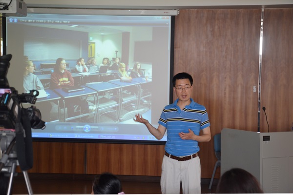 本网讯 6月14日下午两点,由广东外语外贸大学英文学院和人事处教师发展中心共同主办的云山教师沙龙第17场“网络时代的英语写作跨国互动与科研交流”在9教204成功举办。宾夕法尼亚州立大学英语系、亚洲研究系副教授游晓晔博士,与我校师生分享了他在英语写作“跨洋互动”项目中的教学及科研心得,并听取了师生对该项目的意见。出席本次沙龙的有我校文科基地副主任徐海教授、英文学院郑超教授、姜琳副教授及商英学院、英语教育学院等兄弟学院的教师及学生。此外,中南大学的叶洪教授特意从长沙赶来参加本次活动。在活动过程中,游晓晔博士注重与师生的互动;师生们积极发言,各抒己见,会场气氛十分热烈。
