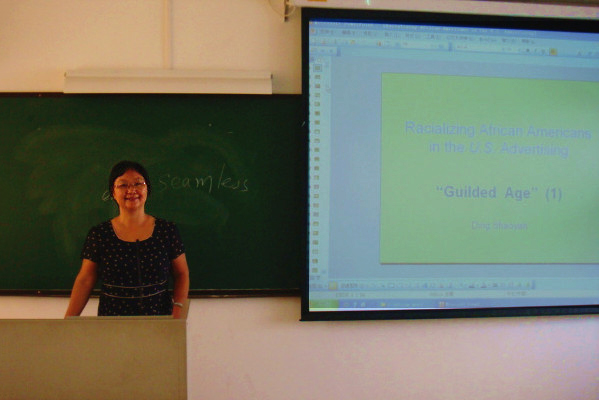 本网讯 9月12日下午,英文学院“美国镀金时代通俗文化系列讲座”第一场讲座——由丁少彦博士主讲的“镀金时代广告中非裔形象的歧视性再现”在七教523室成功举办。讲座由周静琼教授主持。学院院长温宾利与英文学院师生们共同倾听了这场讲座;会场中座无虚席,听众们反应十分热烈。