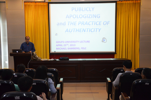 本网讯 4月25日下午2时,受聘我校英文学院的“云山讲座教授”Michael Bamberg教授在学校七教水上报告厅做了题为“向公众致歉 -- 构建可信任的身份”的学术专题报告。Bamberg教授是国际知名语言学家、美国克拉克大学心理学系全职教授、英语系兼职教授;现任《Narrative Inquiry》 (SSCI, AHCI)、《Journal of Narrative and Life Story》(SSCI, AHCI)、《Studies in Narrative》(SSCI, AHCI) 三种国际权威期刊主编,在国际学术界享有重大影响。我校党委副书记陈建平、“珠江学者”冉永平和文科基地副主任董燕萍等专家学者近二百名师生参加了讲座。英文学院院长温宾利主持讲座。