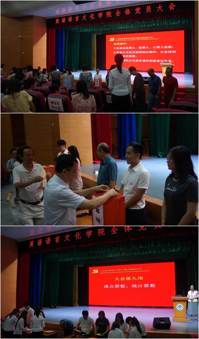 大会审议、表决通过了《坚守初心不辱使命真抓实干共谱华章——在广东外语外贸大学英文学院党员大会上的报告》,宣布学院新一届党委委员候选人、学院出席学校第四次党代会的学生代表候选人名单,宣读校党委《关于同意英语语言文化学院党委换届候选人的批复》,宣读、通过学院党委委员、学校党代会代表选举办法(草案),通过总监票人、监票人、计票人建议名单,以无记名投票、差额选举的方式,选举产生了王蕴峰、吴庄、张欣、林绍雄、黄晓梅(按照姓氏笔画排序)五名同志为新一届英文学院党委委员,杨静、张丽静(按照姓氏笔画排序)两名同志为出席学校第四次党代会的学生党员代表。