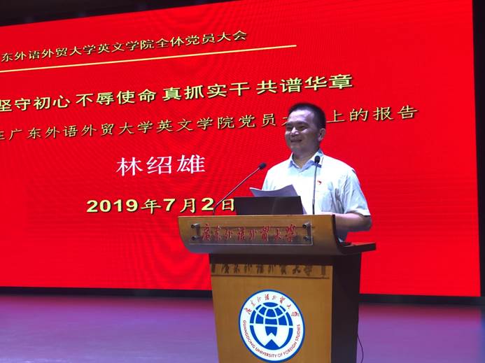 大会在庄严的国歌声中拉开帷幕。首先,英文学院党委书记林绍雄同志代表上一届党委会向大会作工作报告。报告回顾了英文学院党委过去四年的工作,围绕英文学院的政治建设、组织建设、活动建设和文化建设四个方面的主要工作成效,充分肯定了英文学院党委过去四年的工作,总结了宝贵的工作经验,指出了一些需要继续改进的问题,并提出了今后几年的工作设想。