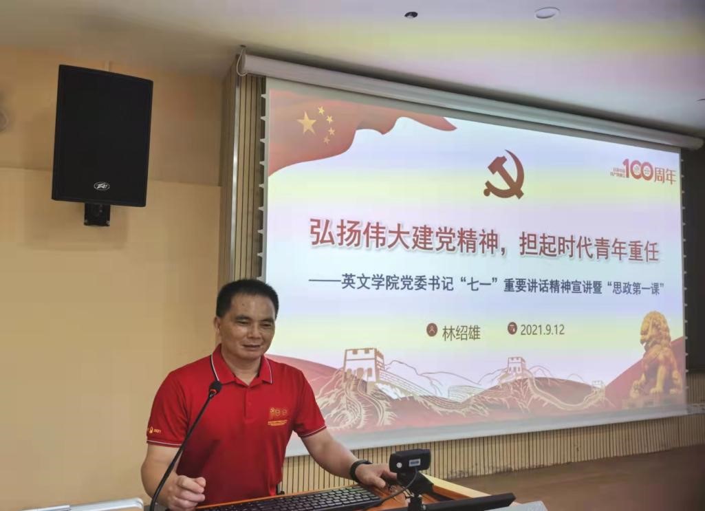 本网讯 为了引导帮助学院2021级新生学懂弄通习近平总书记“七一”重要讲话精神,不断增强同学们的使命感和责任感,2021年9月12日晚上,英文学院党委书记林绍雄老师在北校区第一教学楼时代讲堂并通过腾讯会议平台在第一教学楼215教室同步直播,以“弘扬伟大建党精神,担起时代青年重任”为主题,向学院2021级全体同学宣讲习近平总书记“七一”重要讲话精神、主讲思政第一课。