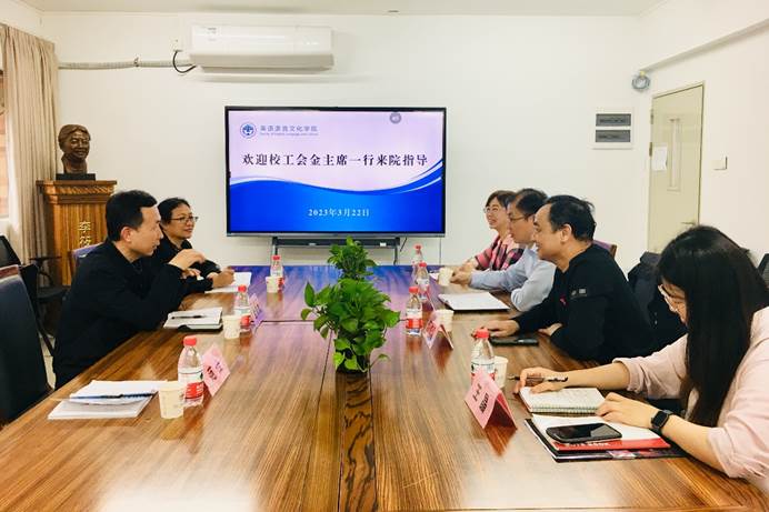 本网讯 2023年3月22日上午,校工会常务副主席金良成、副主席刘红艳一行来我院,就二级工会及“双代会”换届前期工作准备进行调研,英文学院党委书记王则唐、五级组织员何伟儒、英文学院工会主席夏玉坤、工会文体委员王晶出席了座谈会。