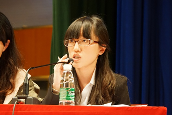 在随后的盘问环节中,正反双方针锋相对,互相质疑,又从经济发展、家庭情况、社会保障等方面捍卫本方观点,他们的连珠妙语无形中给译员们设下了一道道难关。反方四辩杨婧引用了“中国大妈”、“中国城管”、“僧多粥少”、“大头宝宝”等大量社会热词;面对这些困难,译员们沉着冷静的台风,巧妙的化解方式赢得了观众的阵阵掌声。