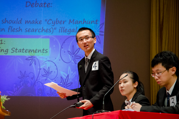 正方一辩阮博慧通过从滋生网络暴民、侵犯隐私等方面来阐明正方观点:人肉搜索是非法的。而反方一辩罗习添则阐述了人肉搜索的优势:对刑侦带来的帮助、表达人民对自由言论的诉求;同时是否非法的界限过于模糊,难以制法,犀利地反驳了正方的观点。