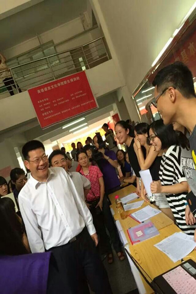 谈到对2015级英文新生的寄语,温宾利讲道:“希望新生们能尽快适应即将到来的军训,尽快地融入新的集体,顺利和快乐地学习和生活。”