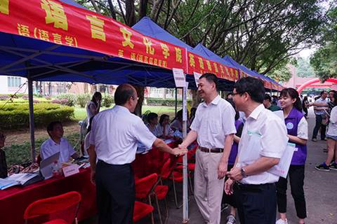 本网讯 6月25日上午9:00,第十八届“广外开放日”在北校区主校道上正式拉开帷幕。英文学院师生代表热情高涨,以饱满的精神接待前来参观咨询的高考考生及家长。我校党委书记、校长隋广军及校党委副书记李云明、副校长刘海春、副校长焦方太等校领导莅临英文学院摊位,与咨询者们亲切地交流,并向现场工作等师生表示诚挚的关怀。
