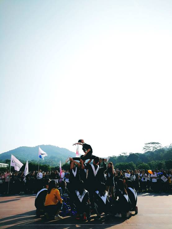 开幕式第一项,升国旗、院旗并奏唱国歌、校歌。飘扬的国旗和院旗,吹动英文人心中拼搏的火焰。升旗仪式结束后,各班方阵入场,整齐划一的口号响彻云霄,别出心裁的表演彰显特色。接着,院舞队、广袤园武术协会、侯乐哋组合分别给大家了异彩纷呈的表演,彰显英文学子的激情和活力。