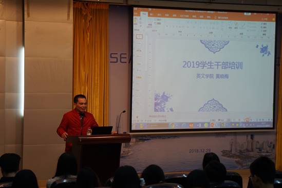本网讯2月28日14时30分,2019年英文学院学生干部培训大会在七教水上报告厅召开。参加培训的有英文学院各学生党支部书记、团学主要干部、研究生会主要干部、各年级级委、各班班长及团支书,学院党委副书记黄晓梅担任本次培训主讲。英文学院党委书记林绍雄及各年级辅导员出席本次培训大会。