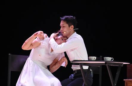 剧中展现了一个令人匪夷所思的故事,为了留住爱人不惜一切代价的艾米丽,似乎可恨之极。但纵观全剧,艾米丽的行为是父亲的独裁和原生家庭环境的影响所致,令人同情。在该剧的舞美方面,四个立方体,两张椅子便是布景;四条红绸,一张红纱增添了舞台的梦幻;一副玫瑰图,若干玩偶、华服、高跟鞋从天而降,舞台营造了诡异而浪漫的氛围。