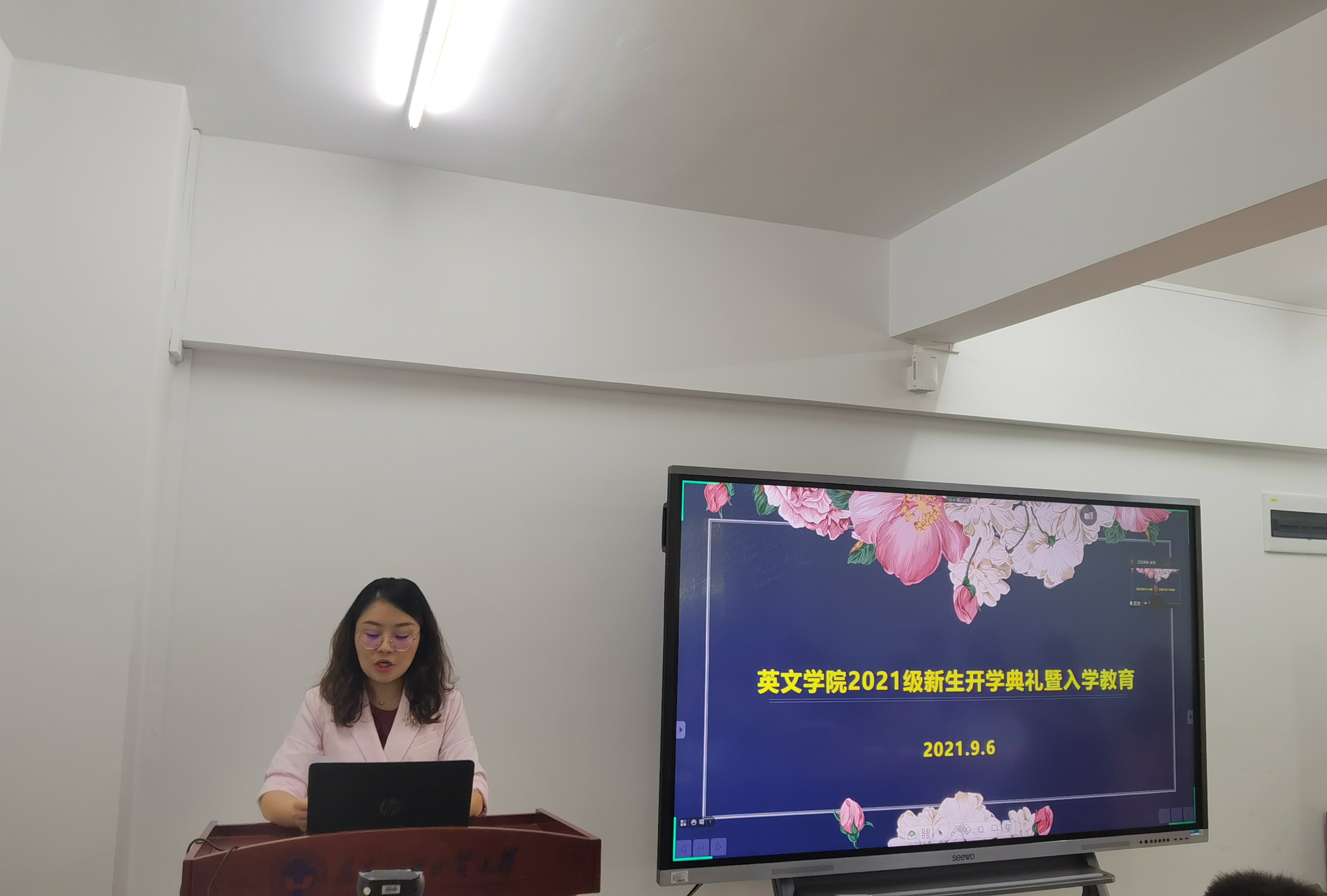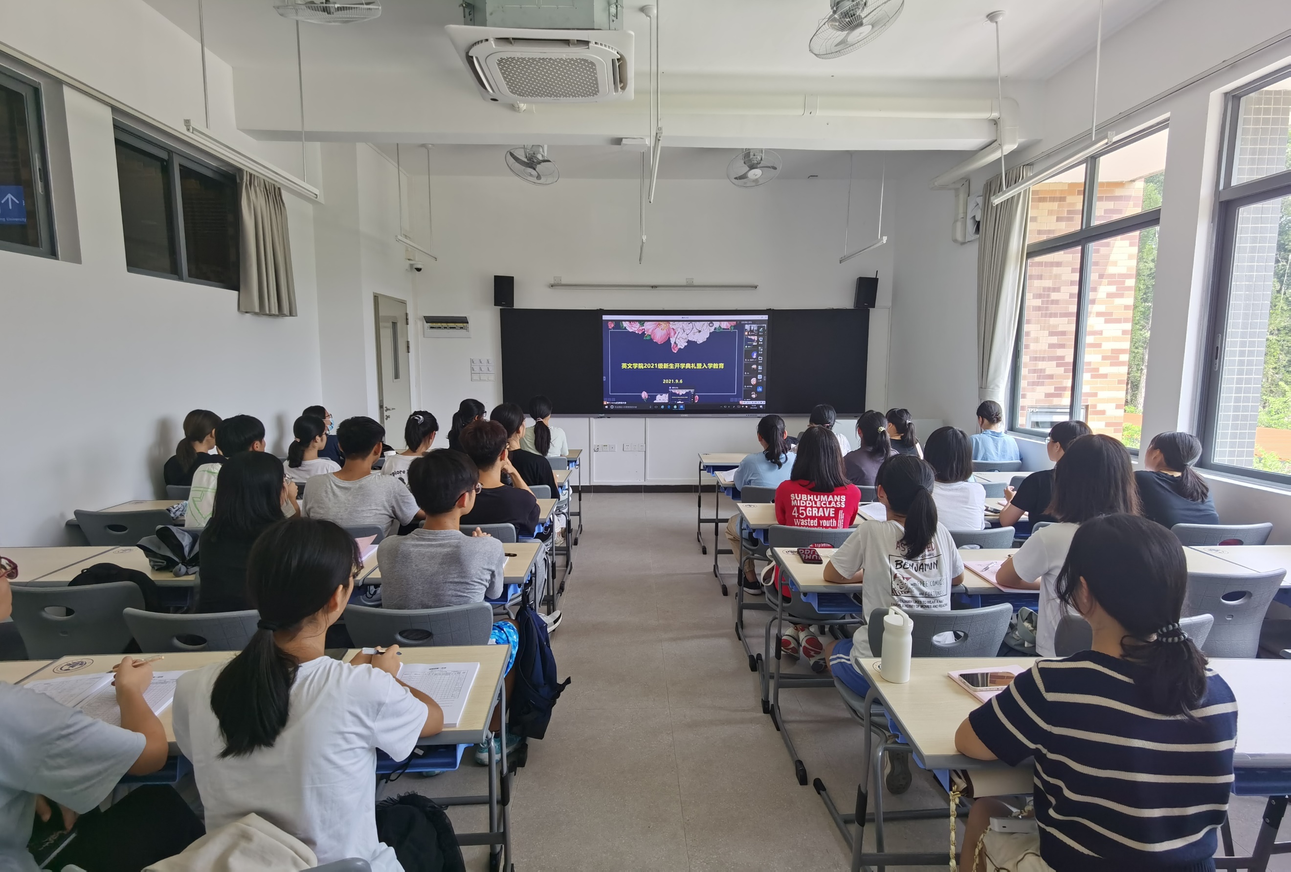 2021年9月6日下午,英文学院举行2021级新生开学典礼暨入学教育活动。英文学院全体领导班子、教师代表、各系主任、全体辅导员及2021级本科生、研究生新生分别在主会场和分会场共同参加仪式,开学典礼由林绍雄书记主持。