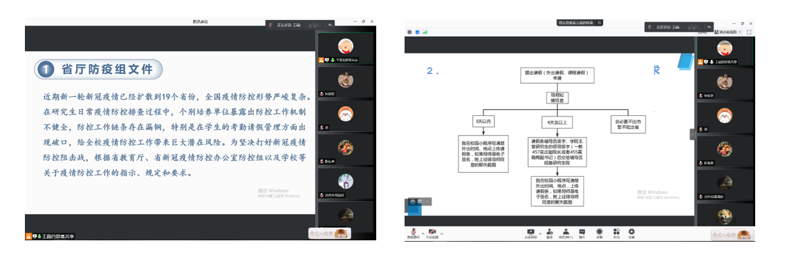 会议从疫情防控、请假和考勤、学术道德、反诈骗、宿舍消防安全、心理健康、毕业就业等七大方面展开,王晶老师首先强调了此波疫情的严峻形势,以及学校近期在防控工作机制上出现的问题及其风险,强调了上至省教育厅对于疫情防控工作的规定和要求。在此基础上明确了研究生外出请假的各项规定和必备程序,对同学们外出请假做出了明确规定。其次,王晶老师还结合《研究生手册》对同学们做出了四个方面的提醒,包括学术道德、学术不端管理办法、学位论文管理办法以及违纪处分规定,告诫研究生们端正学术态度,坚守学术诚信,遵纪守法