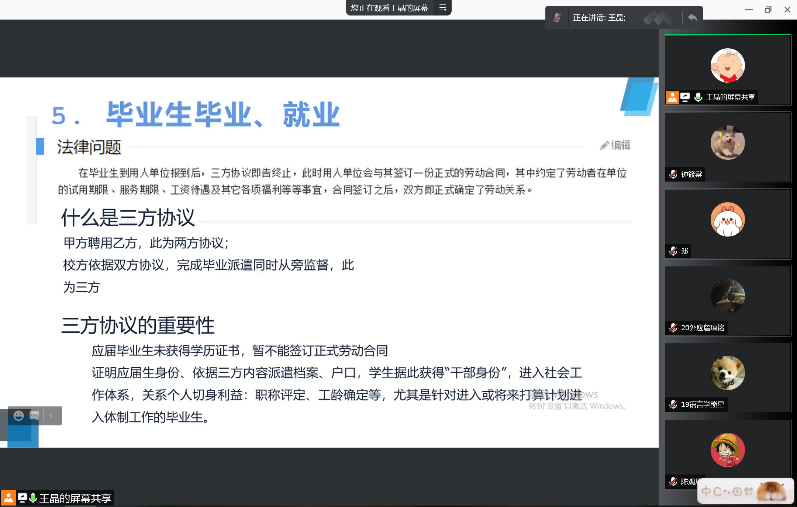 针对毕业生毕业和就业事项,王晶老师就三方协议、毕业注意事项,毕业生找工作时该如何维护好自己的合法劳动权益等,为同学们做出了细致的解读,鼓励同学们积极参与面试,为个人事业谋划好出路。除了找工作,王晶老师提醒到,毕业生们还提前撰写好高质量的毕业论文、关注人事档案、党团组织关系转接、及时更新就业信息等问题,为毕业班研究生规划好毕业旅程。