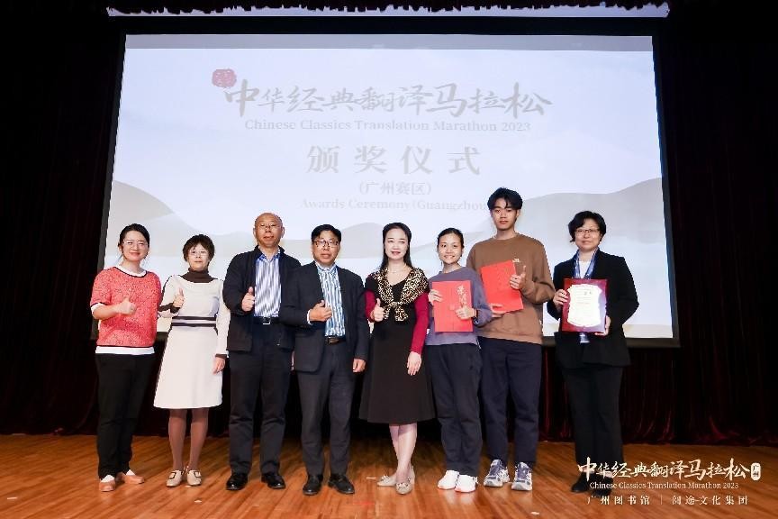 本网讯 “云对雨,雪对风,晚照对晴空……”10 月 22 日,伴随着《声律启蒙》悠扬的旋律,“2023 中华经典翻译马拉松”(广州赛区) 颁奖仪式在广州图书馆(以下简称“广图”)举行。活动当天,共有100 位参赛选手在广图同场竞技,共同传译中华经典。最终,我校张周薇、丘越等 12 名学子胜出,喜获一等奖两项,二等奖两项,三等奖八项,在广图 2023 年度 24 名“中华文化传译人”中占领“半壁江山”。我校英语语言文化学院、英语教育学院、图书馆领导出席活动并代表学院(单位)受领“优秀组织单位”奖牌。英文学院方开瑞教授,翻译与国际传播研究中心主任潘莉教授担任活动嘉宾。