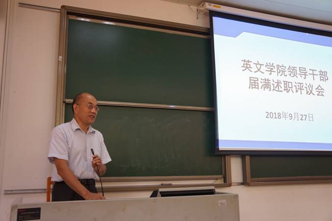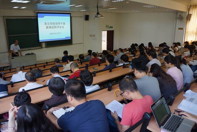 本网讯 2018年9月27日下午,英文学院领导班子在七教213会议室,面向全院教职工述职,并进行民主测评。此次会议是广东外语外贸大学2018年中层领导干部换届工作的重要环节之一,由英文学院党委书记王斌主持,英文学院全体教职工积极参与。