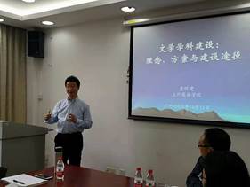 2018年10月11-12日上海外国语大学英语学院院长查明建教授受英美文学系之邀到学院分别就文学学科建设和互文性视野中的世界文学作了两场讲座。11日周四下午在七教412室,查教授作了题为“文学学科建设:理念、方案与建设途径”的专题讲座。我院副院长冯光武教授、副院长张欣教授、文学系全体教师和其他系部分教师、博士生、硕士生共同聆听了本次讲座。讲座由英美文学系系主任付晶晶副教授主持。冯光武副院长为讲座致开场白,他强调“This event happens at the right time, in the right place and with the right person”。