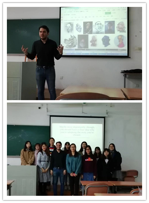 戏剧大赛系列活动之三:2018年12月28日学院英美文学系的外教Kyle作了题为“The Beating Heart of Things: Strategies for Adapting Drama”的讲座,旨在对各剧组的编剧进行培训、提供改编思路及注意事项等。Kyle首先谈到将小说改编为20分钟戏剧的挑战性,认为将剧情快进(fastward)不可取,应该注重主线剧情,节选关键剧情(cut the heart out)。在此基础上,他建议改编时应注意场景、角色、主题的统一性(unity),场景不建议频繁切换;主角2-4个为佳,可以将次要角色糅合;主题应该深刻,能引发观众思考,但不能限制情节发展。同时,他提醒同学们,戏剧是展示想法的舞台,而不是说教的讲坛,主题思想应通过演员的对话、动作,通过引起观众的共鸣与思考达成,而不是靠直接揭露,但切忌太隐晦,难以理解。此外,他提醒同学们,要做好不断修改剧本的心理准备,但切忌对建议“来者不拒”,而且应该结合自己的思考再做取舍。