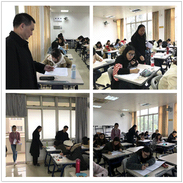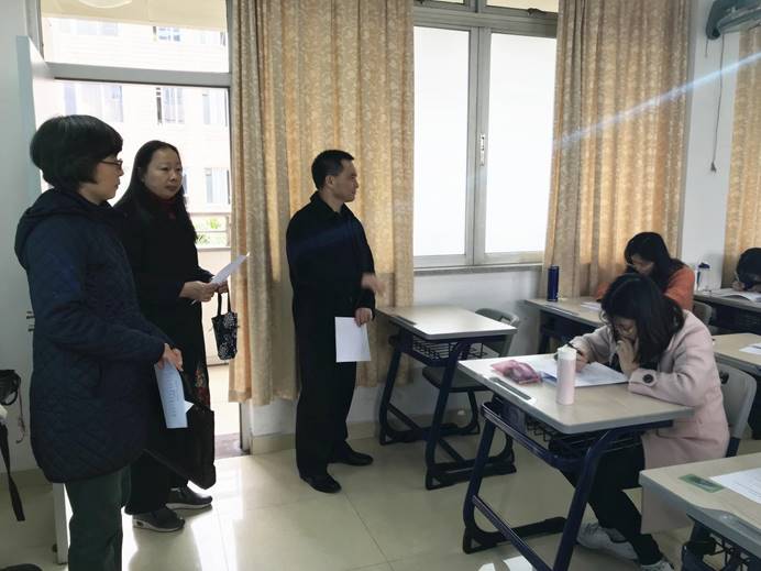 本网讯 为加强期末考试的组织管理和考风建设工作,1月7日上午10点,英文学院党委书记林绍雄、党委副书记黄晓梅、教学副院长韩锐带领辅导员王栋、王晞、马骁、王晶到北校区七教、二教等英文学院学生考试考场巡考,对考场安排、考场秩序、考风考纪、学生精神面貌以及主监考职责履行情况等进行了巡查。