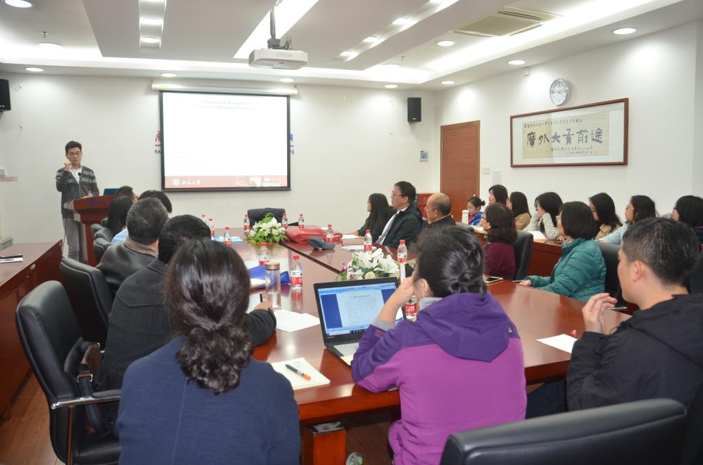 本网讯 2019年1月16日,北京大学外国语学院助理教授、外国语言学及应用语言学中心研究员、博士生导师胡旭辉博士应邀在我院412会议室做了题为Same Root, Different Categories: Encoding Direction in Chinese的学术讲座,采用分布式形态学理论框架对汉语趋向词的复杂性进行分析。浙江大学程工教授、我校温宾利教授、张庆文教授以及来自北京外国语大学、北京语言大学、清华大学等校内外专家学者以及我校博士、硕士研究生约40人参加了本次讲座。讲座由英文学院吴庄博士主持。