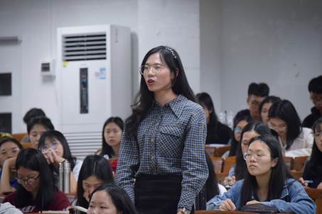 来自1503班的林菁分享了他的“国奖故事”。他向帮助过他的老师同学们致谢。回顾大学,大一的他对自己的要求很严格,努力克服懒散,提升学习效率;大二的他在学习、比赛、双专以及社团活动等多项事务中锻炼了时间管理的能力;大三时他沉下心来认真学习翻译,在众多压力中突破重围;大四上学期他在世界三大翻译学院之一对美国蒙特雷国际研究院进行交换学习,这段学习经历使他的翻译观得到很大的转变,也更激起了他对翻译的热爱。他通过翻译案例,鼓励同学们多思、多积累,在模仿、细节以及提问中学习。