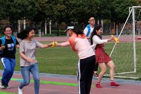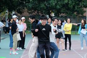 第一个进行的比赛项目是“Run Run Run 趣味接力”。各队参赛选手在本项目中都展现了极强的团队协作能力,选手们克服比赛过程中遇到的失衡、气球爆炸、指压板疼痛、眩晕等困难,飞速奔跑通过赛道,完成挑战。其中,跨班组队的“十点还在组队”,在比赛时团结一心,每一段赛程都表现出色,最终拔得头筹,引得观众阵阵掌声。