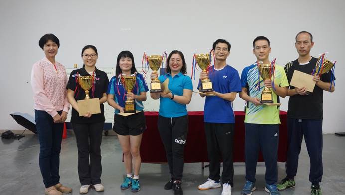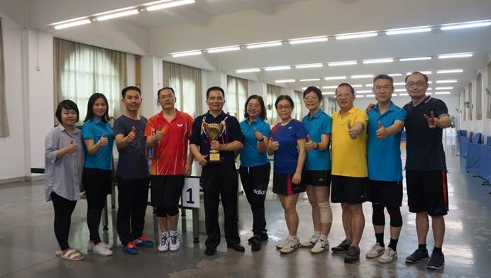 本网讯 4月20日,由大学工会组织的2019年教职工乒乓球团体赛在北校区举行,英文学院教工乒乓球队奋力拼搏、团结进取,后勤人员和拉拉队员用心服务、倾情助威,最终获得了今年教职工乒乓球赛团体第一名的好成绩。