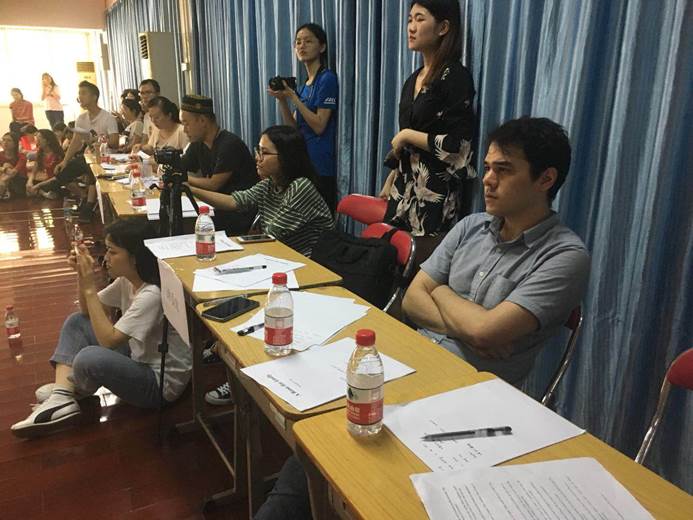戏剧大赛系列活动之六:2019年4月25日在英文学院戏剧大赛彩排现场,英文学院指导老师王琼、郑凌娟、张兰、Kyle以及戏剧表演专家谢明强老师冒着酷暑,耐心地对四个剧组的表演进行了点评。指导老师们对剧组的初次表演给予了肯定,并对剧组尚存在的问题进行了详细的点评并提供了很多宝贵的建议。比如如何控制时长,如何提升演员的表现力等。老师们指出戏剧表演要给观众足够的线索去理解故事情节,表演分寸要拿捏到位,要渲染气氛将观众带入情节。各剧组收获很大,受益匪浅。学院对戏剧大赛非常重视,英美文学系主任付晶晶老师及2016级辅导员王晞老师也亲临现场指导工作。