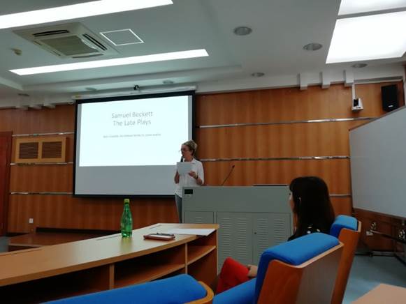 Sarah Jane Scaife教授不仅在戏剧学术研究上成果丰硕,同时也在戏剧实践方面经验良多。本次讲座,Scaife教授与在场的老师、学生分享了她正在进行的戏剧项目——“Beckett in the City:The Women Speak”,项目中共包括由萨缪尔·贝克特晚期创作的四个以女性为主角,关注女性话题的短剧组成。Scaife教授评价到,剧作家贝克特极具人文关怀,其戏剧创作也与爱尔兰历史发展紧密相连。Scaife教授的戏剧团队通过演绎剧中怪诞的戏剧形象,希望体现贝克特短剧中希望能为爱尔兰上世纪被历史和宗教局限而被边缘化的女性发声的意图。她提到,从现象学角度出发,关注戏剧中视觉和听觉呈现,创造性地将贝克特戏剧嵌入极具爱尔兰特色的城市空间—废弃建筑、修道院和街边巷道之中。面对爱尔兰观众,Scaife教授和她的戏剧团队将贝克特戏剧与爱尔兰历史文化紧密结合,对其重新解读,使其成为揭示历史真相、反映大众共有困境、促使当下爱尔兰人回顾历史、思考当下的经典作品。