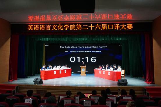 本网讯 11月14日晚上7点,英文学院第二十六届口译大赛于六教报告厅举行,此次大赛的评委有来自暨南大学外语学院的李丹博士,高翻学院口译系主任王巍巍博士,高翻学院口译系教师傅艾,英文学院翻译系许勉君副教授以及英文学院翻译系教师李承。中国国际出版集团记者、编辑David Ferguson教授,英文学院党委书记林绍雄,副院长韩锐,学院部分师生及各年级辅导员出席观摩本次比赛。