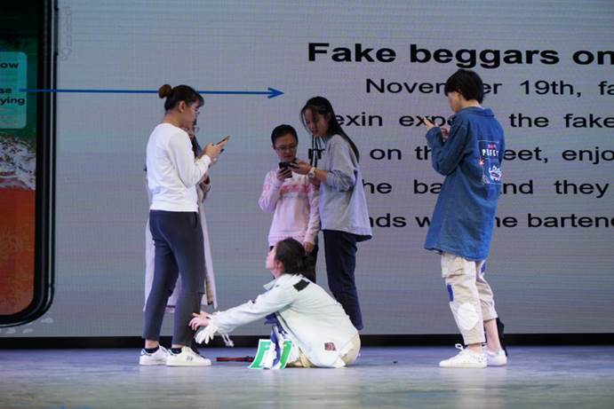 以“雍容华服”出场的1802班让台下眼前一亮,它们的作品TheLove of Doll最终获得了最佳人气奖。在1808班的Internet Beggar Challenge中,虚假乞丐好吃懒做,欺骗良善,把善心消耗殆尽,最终却是真乞丐去承受这一切。对于爱这个话题,1804班用它们的作品Letters给出了回答:如果热爱,务必坚持。1805班的They are just kids通过演绎一个缺乏性知识的小女孩,遭遇性侵却浑然不知的故事,以小见大,揭示社会对性教育缺失的漏洞,发出要加强对未成年人的性教育的最强音。1805班的朗读选手林小豪,充分融入角色,以抑扬顿挫、收放自如的诵读,让一个猥琐的变态男教师活灵活现。
