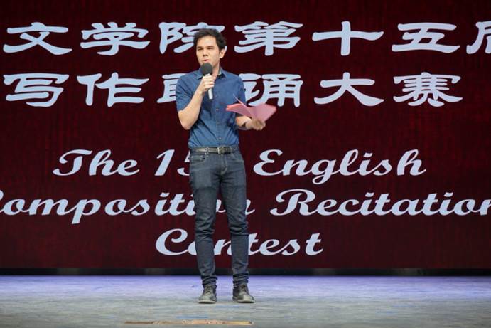 英文学院林绍雄书记作为本次比赛的嘉宾。担任评委的有我校姜琳,梁静壁,潘春梅,张艺琼,赵一农、杜寅寅,外教Kyle Muntz等老师以及全体大二同学共同观看了本次比赛。