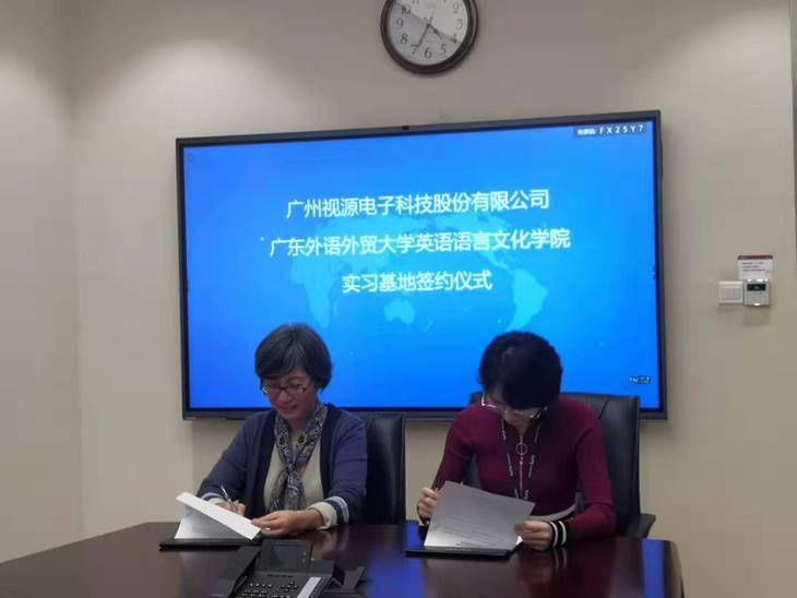 本网讯 为建设卓越人才体系,提升就业质量,发挥校企协同育人功能,1月6日下午,英语语言文化学院与广州视源电子科技股份有限公司(CVTE)校企合作实习基地签约揭牌仪式于广州黄埔区CVTE第二产业园区举行。CVTE人力资源高级总监高海燕,我院党委副书记黄晓梅、副院长韩锐作为双方代表出席实习基地签约揭牌仪式,辅导员马骁和学生代表随行前往。