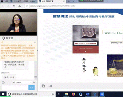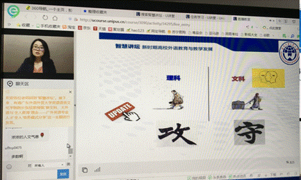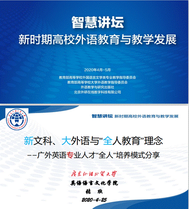 本网讯 4月25日,英文学院院长张欣教授应邀参加外语教学与研究出版社主办的“新时期高校外语教育与教学发展”智慧讲坛,并在线与全国高校外语教育专家学者进行了题为“新文科、大外语与全人教育理念---广外英语专业人才‘全人’培养模式分享”的主题发言,解读英语专业内涵与困境,分享广外英语专业“全人理念”和“分类卓越”人才培养经验与实现路径。