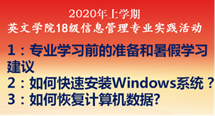 语言信息管理方向此次为学生准备了两场讲座。讲座一主题为“往届信管专业毕业生就业和考研情况总结以及就业信息获取”,由系主任蒋铁海副教授主讲,于7月19号上午8:15—10:15线上举办,面向2017级信管专业和其他专业学生。讲座详细介绍了信息管理专业方向往届部分毕业生的求职或者考研经验,以及如何获取就业和考研信息,这些经验分享让17级信管专业同学受益匪浅,十几个相关度高的就业公众号的推荐也让同学们感到非常实用!讲座二主题为“进入专业课程学习前的准备(系统安装和数据恢复)”,也是由蒋铁海副教授主讲,时间7月19号(星期二)下午2:30—4:30,面向2018级信管专业方向全体同学。讲座让18级信管专业方向同学提前进入专业课程学习状态,让他们学会了系统安装和数据恢复的方法,提高了他们动手操作的能力。