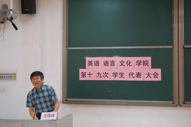 王蕴峰老师在致辞中代表学院党委对会议的召开表示祝贺,学院党委肯定了我院学生会在过去一年学生工作中取得的良好成效。同时,他也对各位代表和学生骨干寄予殷切希望,勉励即将上任的新一届学生骨干们接续努力,乘风破浪。最后,王蕴峰老师预祝英文学院第十九次学生代表大会获得圆满成功。