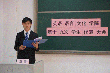 英文学院团委书记马骁在致辞中向所有代表和学生骨干们表示了感谢,同时再次阐发了学生代表大会的时代意义。他代表学院团委对新一届学生会委员提出新的建议,希望各学生骨干做到严于律己、开拓进取、坚持“代表学院,服务同学”的宗旨。