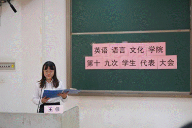 英文学院团委副书记王佳同学向出席大会的代表们作英文学院第十九次学生代表大会筹备工作报告。学生会副主席龚心沂同学向大会作代表资格审查报告。
