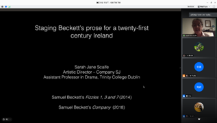 在论坛最后,爱尔兰都柏林三一学院Sarah Jane Scaife教授做了题为“在21世纪的爱尔兰上演贝克特的散文”(“Staging Beckett’s Prose for a Twenty-First Century Ireland”)的发言。她以图片和视频相结合的方式讲述了她参与制作的数个贝克特戏剧改编的实例,生动描述了将贝克特散文搬上舞台的创造性设计与布局,为听众带来了一场视觉盛宴。
