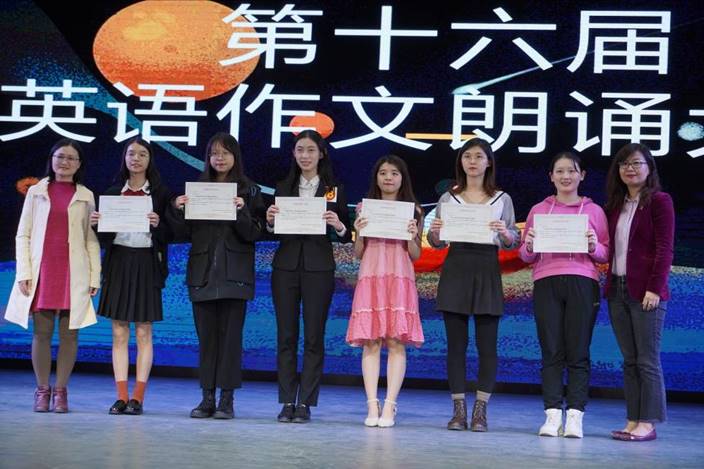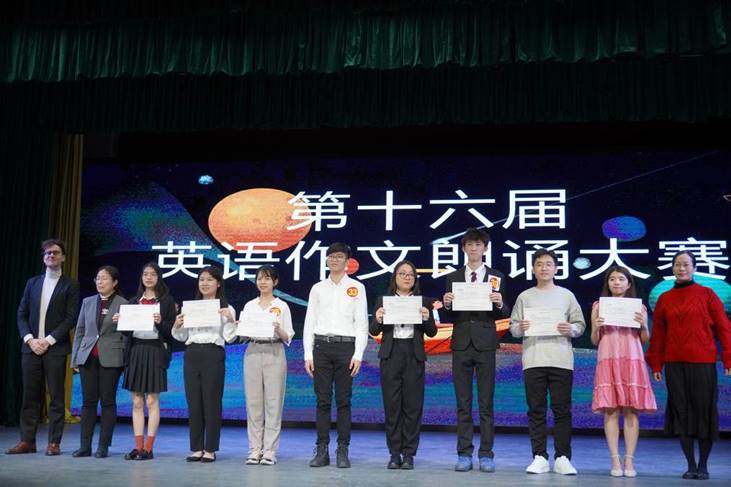 最后,嘉宾和评委们为本次英语作文朗诵大赛获奖的班级代表及选手颁发奖状。