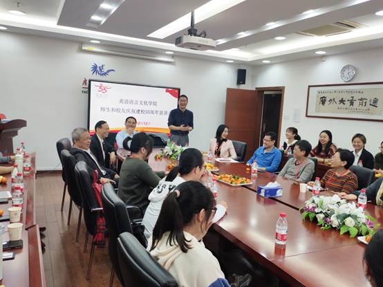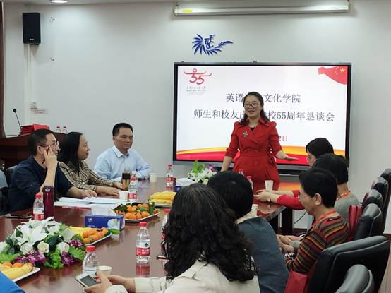 本网讯 12月12日下午,英文学院在七教412召开了英文师生和校友庆祝建校55周年恳谈会。会议由学院党委书记林绍雄主持,学院院长张欣、党委副书记黄晓梅、办公室主任夏玉坤,学院校友会第二届理事会副会长谢杭东、莫婉洁、刘承志,理事林德雄、陈辉、胡文莉、唐晓宓,校友会秘书朱永晖,校友邱华玲,英文学院教师谢元花、钟虹以及各年级本科生、研究生代表们参加了会议。