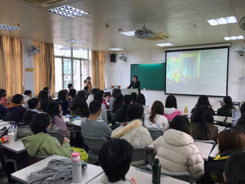 黄蓓老师引导同学们给戏剧下定义、简短介绍各国戏剧种类及其区别,别开生面地为大家追述了戏剧的历史渊源、社会背景和相关文化。随后,她从小丑、盲人和疯癫者三类角色来剖析戏剧中的“非常态”人物。通过对《李尔王》、《麦克白》、《群盲》等经典剧目中的人物进行分析,同学们更深刻地学习了这三种角色在戏剧中所起的特殊作用和代表意义。她鼓励同学们重读经典,多对剧中的一些细节提出问题,加深思考和理解。