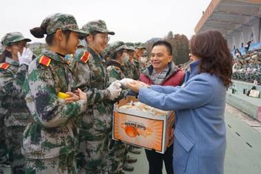 学院领导老师与学生骨干、朋辈导师为军训新生发放慰问品