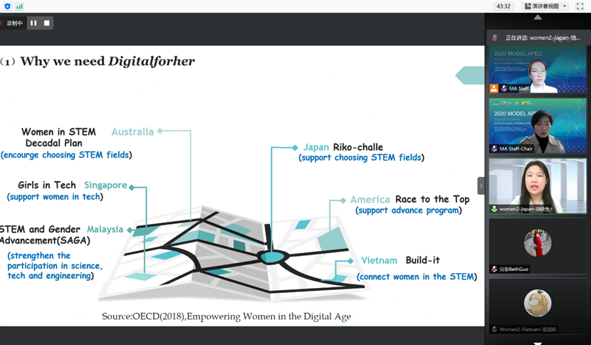 由于疫情,2020 MODEL APEC大会全线云端进行。本次大会围绕Digital Transformation为主题开展,下设Women、Education、SMEs三个分议题,来自60+学校的大学和中学青年代表分为7场会议,结合时事展开讨论并提出亚太地区的合作发展建议,最终形成政策建议文件,为APEC后疫情时代的发展方向提出来自青年的建议。